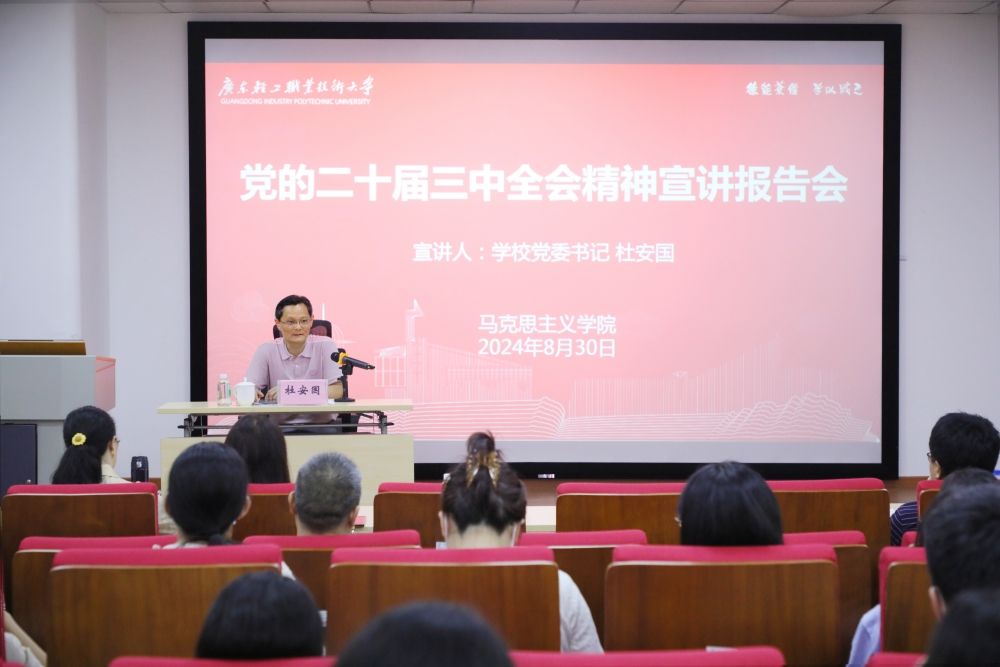 杜安国结合学校实际,用通俗易懂的语言和生动的案例,阐述了全会精神在学校的实践要求。他指出,全会通过的《决定》,是新时代新征程上推动全面深化改革向广度和深度进军的总动员、总部署。学习好贯彻好党的二十届三中全会精神是当前和今后一个时期全党全国的一项重大政治任务。学校各级党组织和广大党员干部要深刻认识党的二十届三中全会召开的重大意义,深刻领会习近平总书记关于教育的重要论述的一系列新思想、新观点、新论断的核心要义、丰富内涵和实践要求,紧紧抓住党和国家统筹推进教育科技人才体制机制一体改革的大好机遇,高位谋划推进学校教育科技人才体制机制一体改革,聚焦学校重点工作和关键环节,进一步大力推进育人方式、办学模式、管理体制、保障机制等各项改革,以高水平职教本科建设更好支撑和服务中国式现代化。