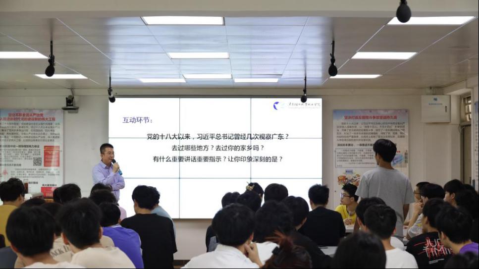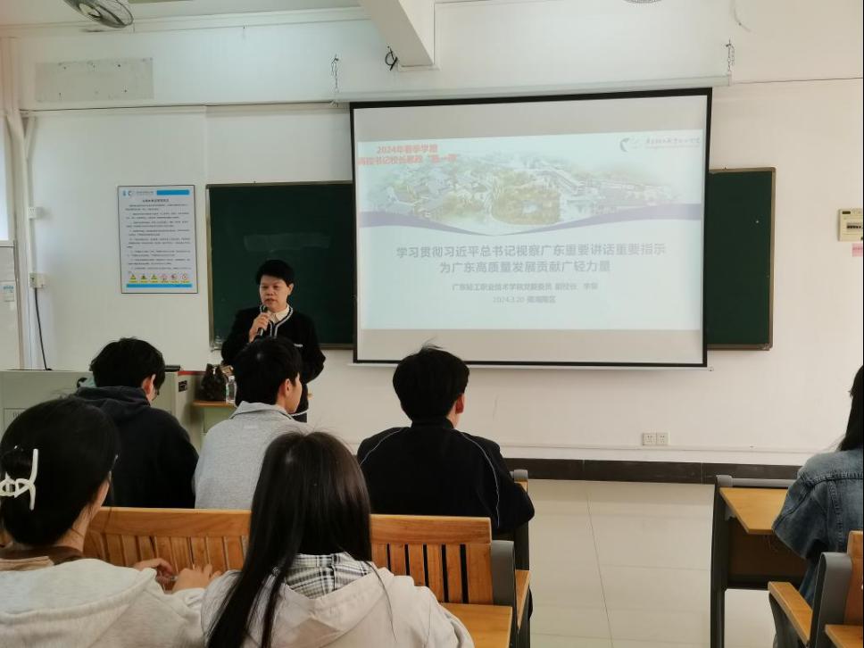 3月28日上午,邓毛程在南海校区北区行政办公楼3304课室,以“学习贯彻习近平总书记视察广东重要讲话重要指示为广东高质量发展贡献广轻力量”为主题,为工业互联网221班和222班的同学们讲授新学期“思政第一课”。邓毛程引导同学们深刻领悟习近平总书记对广东的殷殷嘱托,勉励同学们汇聚青春正能量、争当时代生力军。
