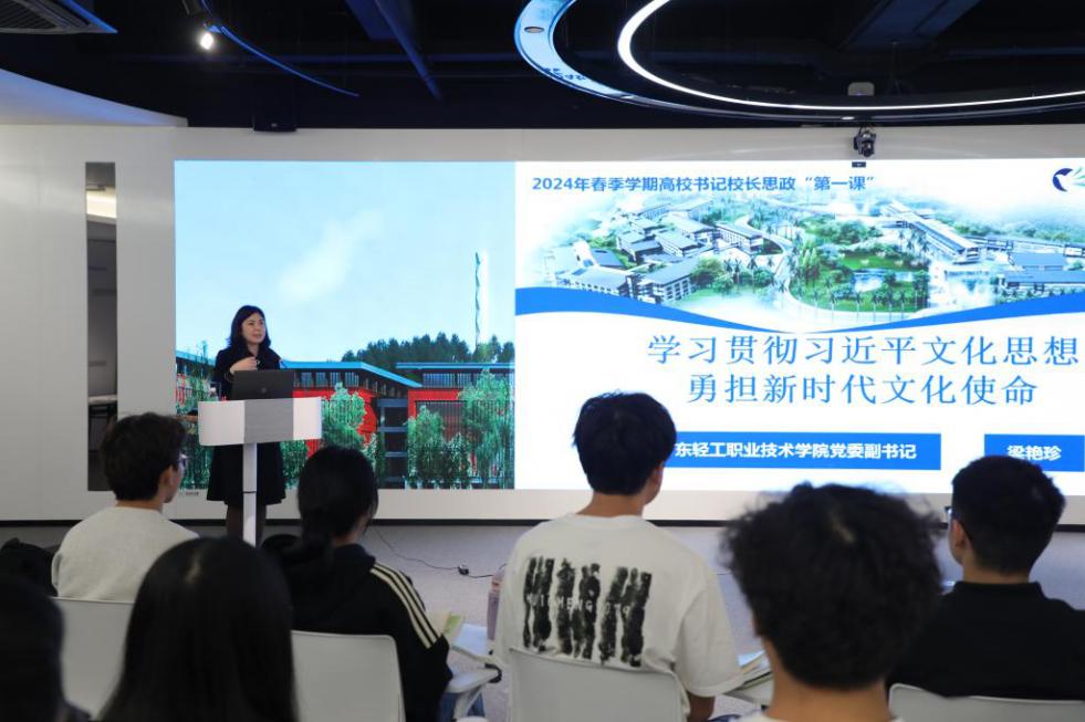 3月20日上午,在新港校区第二工业实训楼多功能展示中心,梁艳珍以“学习贯彻习近平文化思想 勇担新时代文化使命”为题,为我校电商231、跨境电商231班的同学讲授了新学期“思政第一课”。梁艳珍引导学生从“四个维度”系统把握习近平文化思想的核心内涵,从“三个方向”全面学习贯彻习近平文化思想,勉励青年学生勇担新时代文化使命,不断创造属于我们这个时代的新文化。