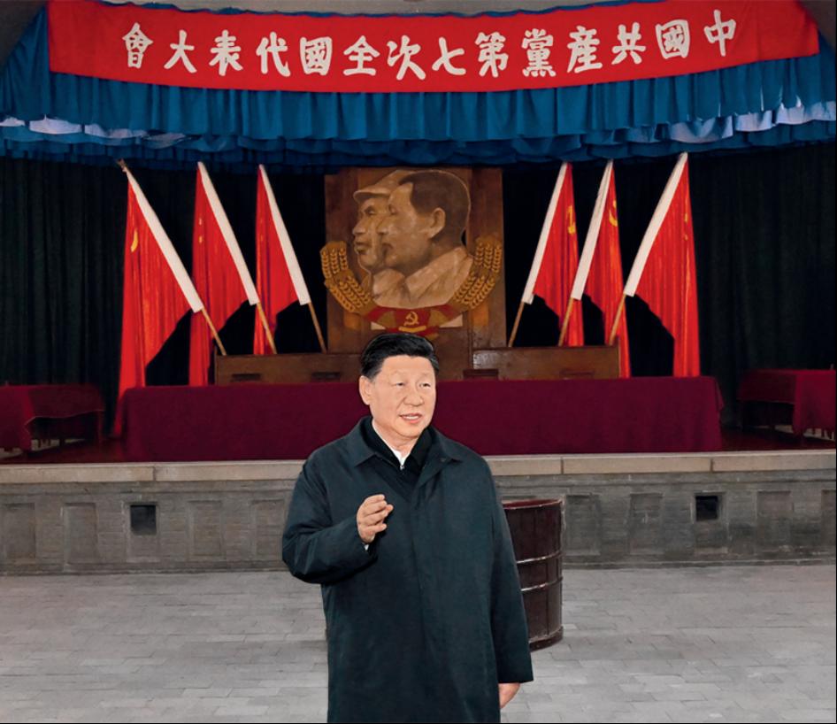 2022年10月27日,中共中央总书记、国家主席、中央军委主席习近平带领中共中央政治局常委李强、赵乐际、王沪宁、蔡奇、丁薛祥、李希,瞻仰延安革命纪念地。这是习近平在杨家岭瞻仰中共七大会址。