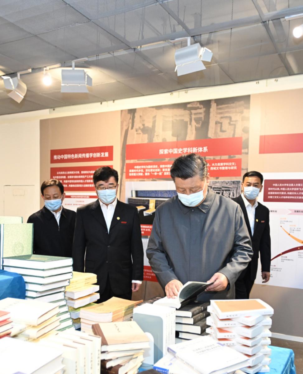中国人民大学图书馆以人文社会科学学术性文献馆藏为主,有藏书410余万册。习近平来到这里,考察馆藏红色文献、古籍集中展示,察看现代化检索平台和复印报刊资料等数字化学术资源,听取学校加强文献古籍保护利用,促进理论研究成果转化应用等情况介绍。习近平强调,人民大学馆藏红色文献,鉴证了我们党创办正规高等教育的艰辛历程,是十分宝贵的红色记忆,要精心保护好,逐步推进数字化,让更多的人受到教育、得到启迪。要运用现代科技手段加强古籍典藏的保护修复和综合利用,深入挖掘古籍蕴含的哲学思想、人文精神、价值理念、道德规范,推动中华优秀传统文化创造性转化、创新性发展。要加强学术资源库建设,更好发挥学术文献信息传播、搜集、整合、编辑、拓展、共享功能,打造中国特色、世界一流的学术资源信息平台,提升国家文化软实力。